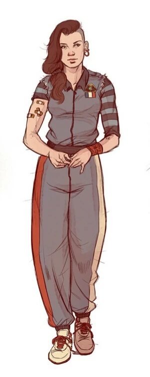She is described wearing faded French orbital fatigues and new white sneakers, a blue zip suit with the sleeves ripped out at the shoulders. Her dark hair was drawn back, by a band of silk printed with soe pattern representing either microcircuits, or a city map. She smokes Yeheyuan filters, put in an ankle pocket.