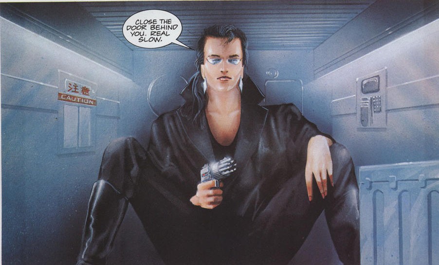 Molly stalks Case in Chiba in the Neuromancer graphic novel. Art by Bruce Jensen