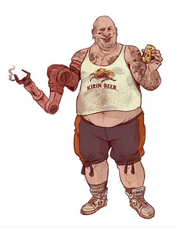 Considering that in Chiba everyone can modify his appearance, his ugliness is legendary. He is 120kg, he has a wrinkled face with 2 small brown eyes, his shaven head filmed with sweat. When he smiles, he reveals a webwork of decayed teeth and East European steel prosthetics. He is probably German as he calls others "Herr".