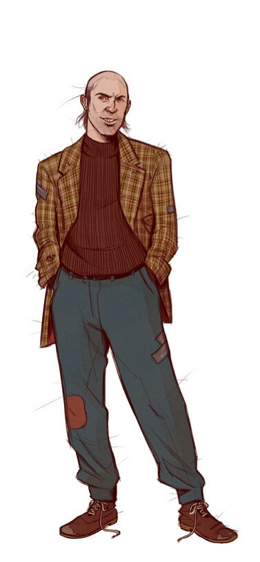 He is seen wearing an old, tattered tweed jacket, which is so wide that floats across his shoulders and doesn't settle into position. He is armed with a kind of handgun when receiving visitors.
