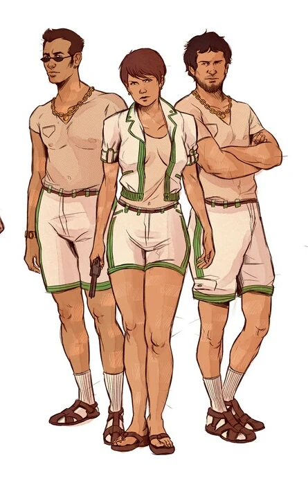 One morning they entered Case's room and waiting for him to return, and told him he is under arrest. They wore perfect white sportsclothes contrasted by their stenciled tans. Pierre and Roland wore identical gold chains around their necks. They all had cosmetic surgeries to look young. They spoke Parisian French among themselves, knowing that Case would not understand it, only that they knew about names like Dixie Flatline, Armitage, Sense/Net and Panther Moderns. They searched his bag, clothes and asked about "Rose Kolodny". Case revealed that he was hired to make a run somewhere, but without knowing the nature of their target.